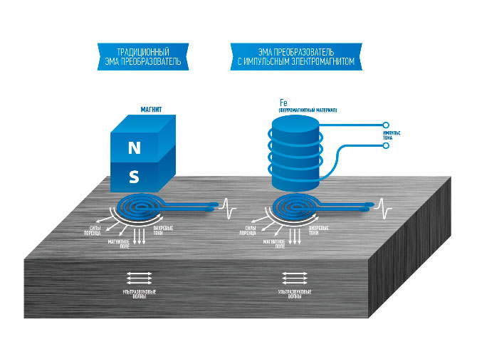 Схема традиционного ЭМА преобразователя и ЭМА преобразователя с импульсным электромагнитом
