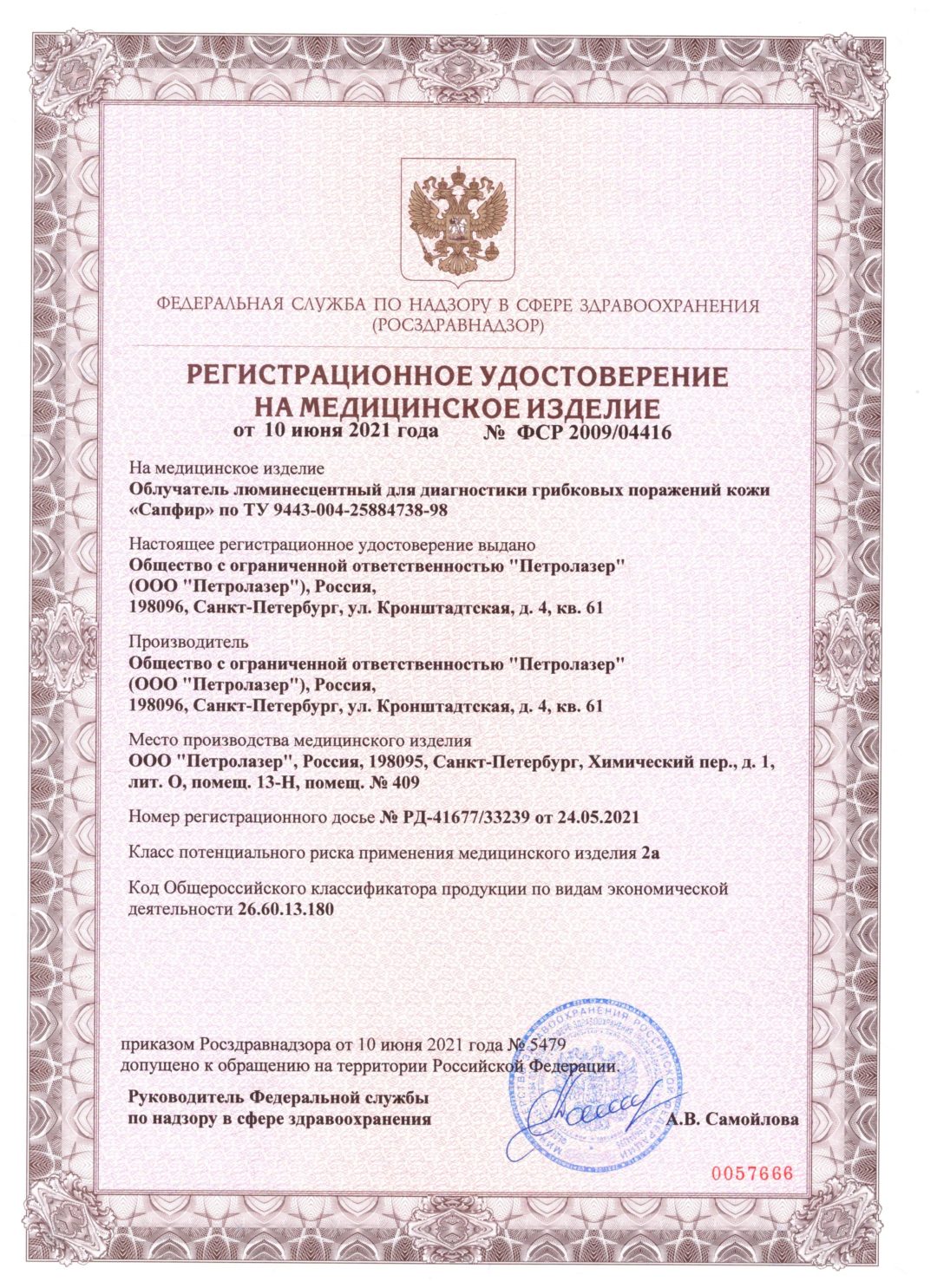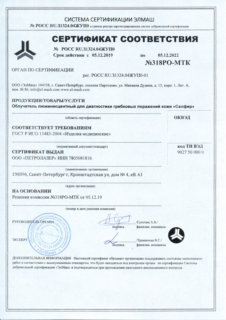 Наименование медицинского изделия — «Облучатель люминесцентный для диагностики грибковых поражений кожи». Копия Р.У. и сертификата соответствия от 2021 года доступны в разделе «сертификаты».