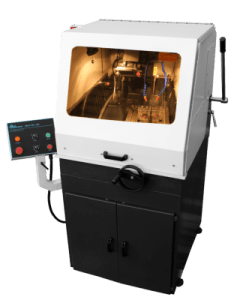 Просторная камера отрезного станка оснащена яркой подсветкой и позволяет за несколько секунд сменить отрезной диск и провести обслуживание двигателя. Универсальный Т-образный столик с богатым набором зажимов позволяет работать с образцами любых форм. Система циркуляционного охлаждения образца имеет две настраиваемые форсунки и фильтр охлаждающей жидкости.