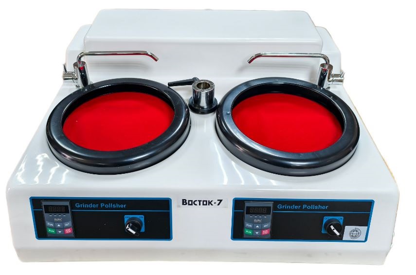 - Плавное изменение скорости вращения дисков в диапазоне от 50 до 600 об/мин. или 2 постоянные скорости шлифовки-полировки 150 и 300 об/мин.