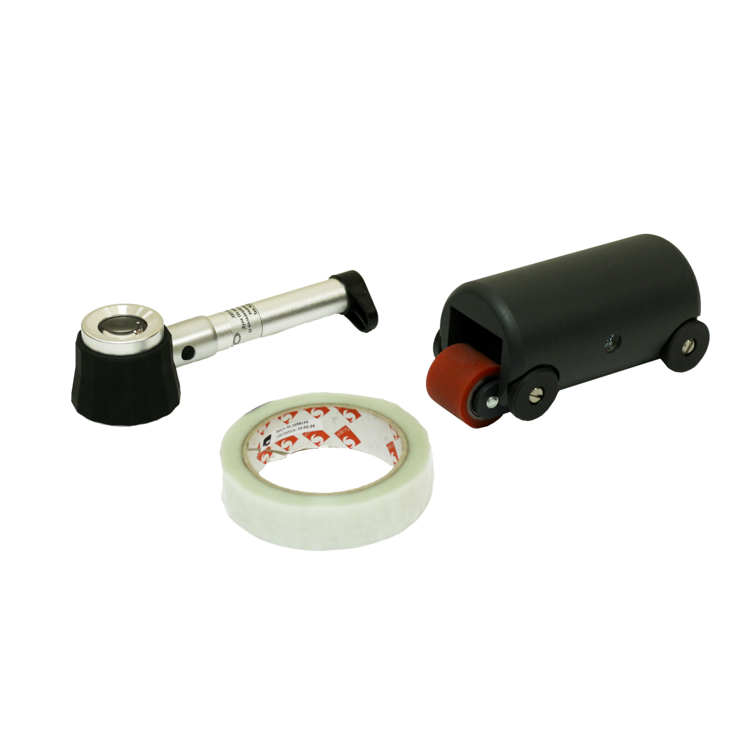 Запыленность поверхности оценивается по сравнительной таблице количеством и размером частиц пыли на липкой ленте-скотче, наклеенной на испытуемую поверхность и прикатанной нагрузочным роликом. Нагрузка на полиуретановый ролик обеспечивается пружиной, в результате чего ролик прижимает ленту к испытуемой поверхности с постоянным усилием.