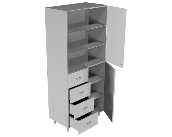 Шкаф для лабораторной посуды НВ-800 ШП. Шкаф НВ-800 ШП предназначен для хранения лабораторной посуды с 2 полками-вкладышами и 2 стеклянные полками. 4 выдвижных ящика. Шкаф изготовлен из ламинированной ДСП с противоударной кромкой ПВХ 2 мм на фасадах. -сверху стеклянные дверцы.-2 стеклянные полки толщиной 5 мм-снизу 4 выдвижных ящика-снизу 1 дверка и 2 полки-вкладыши-металлические ножки 100 мм