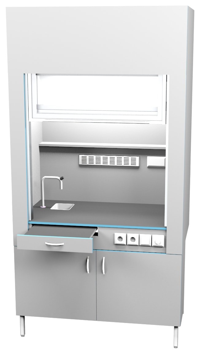 Шкаф вытяжной с сантехникой ШВ НВК 1200 МОН+ (1200×716×2200) Описание: Вытяжные лабораторные шкафы применяются при работе с токсичными и вредными летучими материалами, с чистыми материалами, с растворением или разложением под температурной обработкой, при проведении анализа проб и многих других. Особенности: Полипропиленовая раковина, обладающая высокой химической стойкостью Химически стойкий кран из латуни с полипропиленовым напылением для подключения холодной воды Дополнительная подсветка сбоку с плавной регулировкой Выдвижной столик Вытяжка из нижней тумбы позволяет хранить в ней реактивы Ударопрочный подъемный экран легко поднимается одной рукой Экран в поднятом состоянии не увеличивает высоту шкафа Внутри рабочей камеры полочка для хранения реактивов Две влагозащищенных розетки с крышкой внутри рабочей камеры Специальные доводчики в тумбе позволяют закрывать тумбу бесшумно По заказу столешницы могут быть выполнены из: химстойкого пластика керамогранита (плитка) полипропилена нержавеющей стали монолитной керамики эпоксидного керамзита