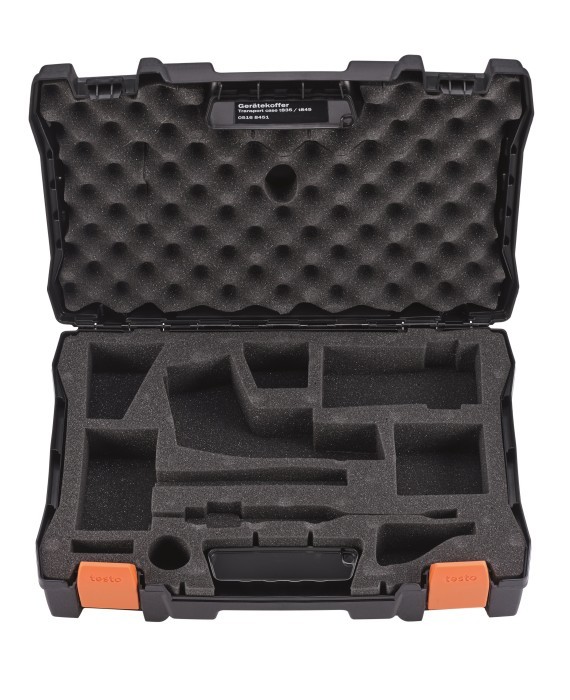 testo 845, инфракрасный термометр с крестообразным лазерным целеуказателем, со встроенным модулем влажности, переключаемой оптикой для измерений на близких и дальних расстояниях, разъемом для контактного зонда температуры, оптическим/акустическим сигналом тревоги, памятью для измеренных значений, ремнем для переноски, ПО для ПК, USB кабелем для передачи данных, алюминиевым кейсом, батарейкой и заводским протоколом калибровки
