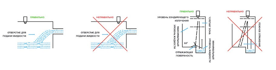 Датчик устанавливается в верхней части ёмкости. Ультразвуковой сигнал, отражаясь от верхней границы объёма сыпучего вещества или поверхности жидкости, возвращается обратно и прибор вычисляет уровень заполнения ёмкости. Чем быстрее сигнал вернется обратно, тем больше заполнена емкость. Имеется ряд ограничений на способы монтажа датчика.