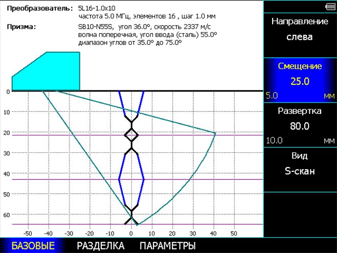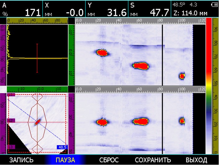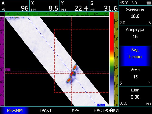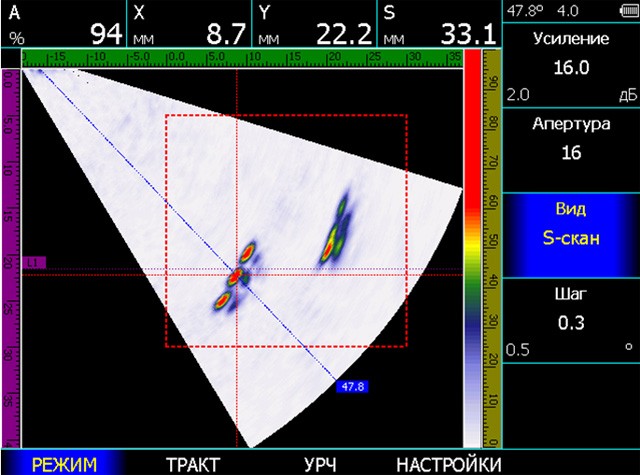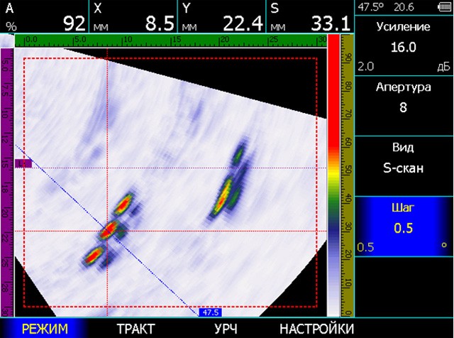 Регулировка рабочей апертуры преобразователя и шага лучей синтезируемого скана позволяет выбрать оптимальное соотношение между производительностью контроля и точностью отображаемой картинки.