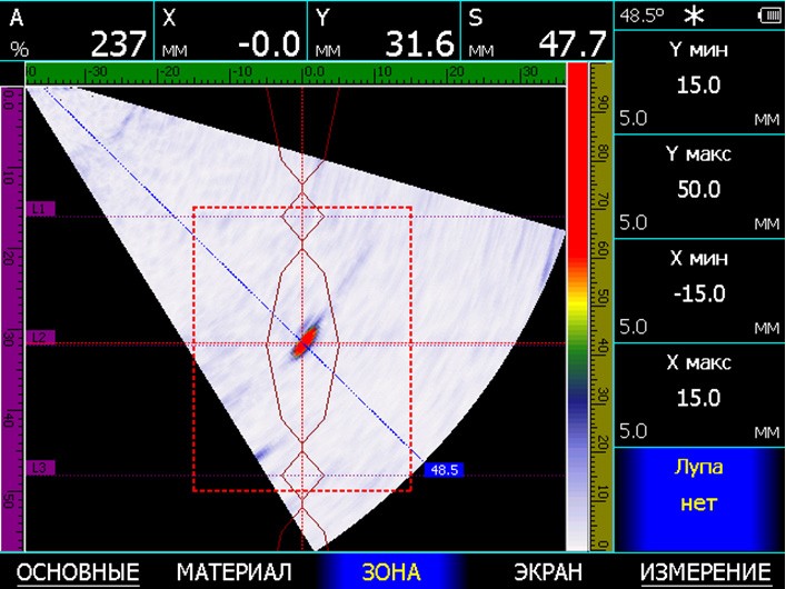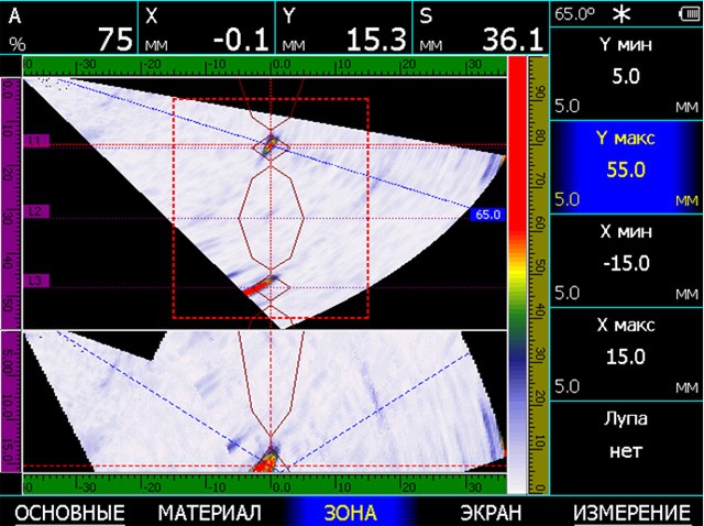 Регулируемая зона для выделения участка скана, в котором происходит контроль сигнала. Режим «лупа» — для вывода зоны контроля на весь экран.