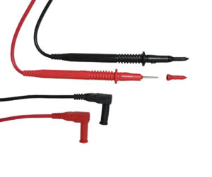 Измерительные щупы для мультиметров. Комплект состоит из красного и черного щупов, с изоляцией из ПВХ и угловыми укрытыми в корпус однополюсными штепселями (типа "банан") с заглушками.