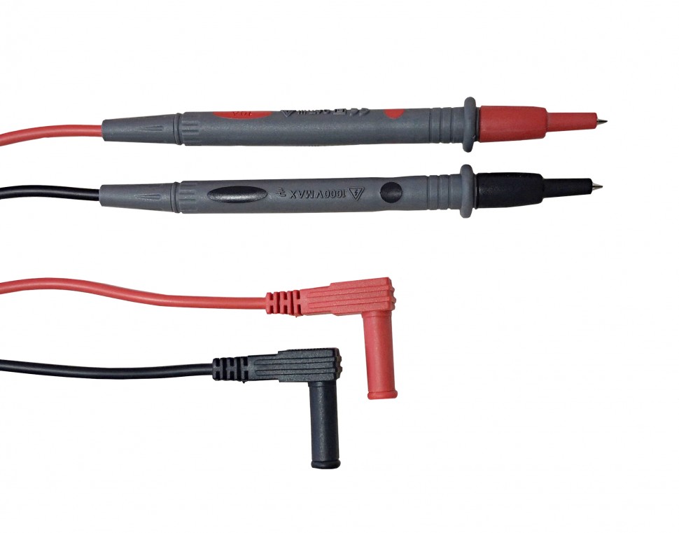 Измерительные щупы для мультиметров. Комплект состоит из красного и черного щупов, с изоляцией из ПВХ и угловыми укрытыми в корпус однополюсными штепселями (типа «банан») с заглушками.