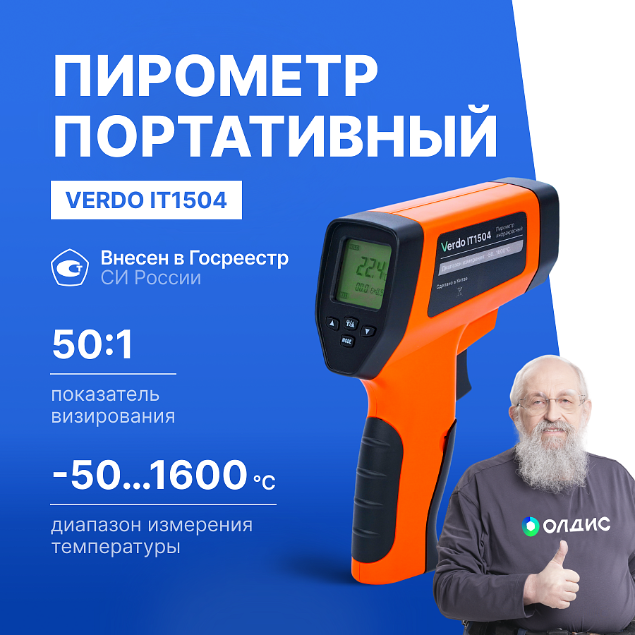 Инфракрасный пирометр Verdo IT1504 бесконтактный измерительный прибор, предназначенный для быстрого и точного определения температуры поверхности различных объектов. Он использует инфракрасную технологию для обнаружения и анализа инфракрасного излучения, испускаемого объектом, и преобразует его в электрические сигналы для отображения температуры на цифровом дисплее. Прибор оснащен жидкокристаллическим дисплеем с подсветкой, позволяющим считывать показания в условиях различной освещенности. Применение инфракрасного пирометра целесообразно в различных отраслях промышленности, включая металлургию, машиностроение, энергетику и HVAC-системы. Прибор также находит широкое применение в лабораторных исследованиях, строительстве и коммунальном хозяйстве.