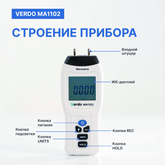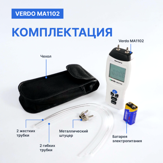 Устройство способно работать с различными единицами измерения давления, включая Па, мбар, кПа, дюймы водяного столба и другие. Высокая точность измерений делает Verdo МА1102 универсальным инструментом, который находит применение в различных областях, где требуется высокая точность, таких как системы отопления, вентиляции, кондиционирования воздуха, а также в инженерных и промышленных системах.