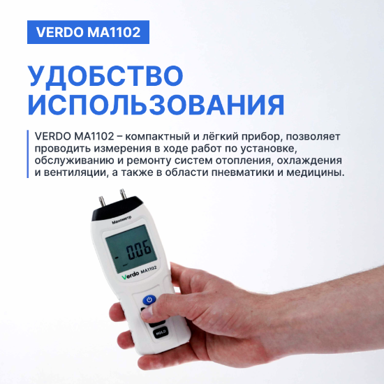 Verdo МА1102 представляет собой компактный и лёгкий дифференциальный манометр, предназначенный для точного измерения разницы давлений между двумя точками в воздушных и газовых системах.