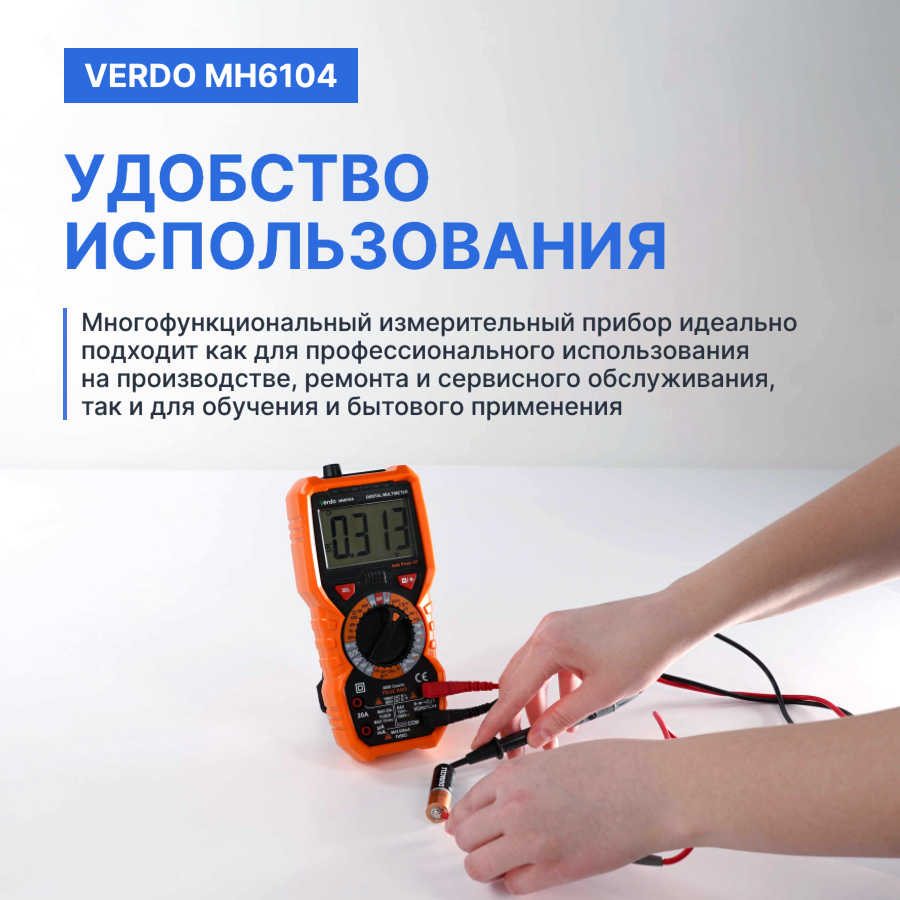 Мультиметр VERDO MH6104 – это ручной цифровой мультиметр с функцией отображения истинного среднеквадратичного значения (TrueRMS) и большим жидкокристаллическим дисплеем с подсветкой, и фонарем, что облегчает считывание показаний. Мультиметр оснащен функцией защиты от перегрузки и индикатором разряженной батареи. Этот многофункциональный измерительный прибор идеально подходит как для профессионального использования на производстве, ремонта и сервисного обслуживания, так и для обучения и бытового применения.